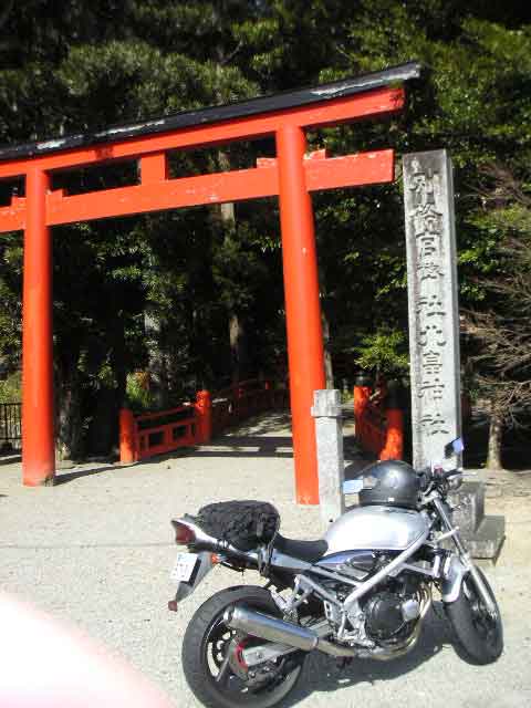 所謂”鬱”な人でした。(自分でそういう風に判断するのもどうかと思うけど) 万年、五月病な野郎ですけど・・・今までにないくらいひどかった。 家でも、仕事中でもいらんことを考えていらいらしてしまう。そんなんがしばらく続き、道場の日。 いらいらしてるけど、道場で汗でも流してすっきりしようと道場に行った。 練習も終わり。 最後にいつも先生としゃべるのだけれど、「そんな顔をして道場にはこないで」と言われた。 結構怖い顔はしてたと思うけどそこまででてたかな? ついでに、「どっかに行ってくればいいんじゃないの?」とアドバイスを受けた。 そのときはそれも有りかな?と思っていた。 朝方になっても、一向に寝られない。 起きているといらんことを考えて、いらいらしてしまう。 自分でも、相当やばいと思い。周りの人達にも迷惑がかかり始めているし・・・。 そのとき、先生のアドバイスが頭に浮かび。ちょうど仕事も休み。 さっそく地図を開く。 去年一度行った青山高原の方に行こうと漠然と決める。そう決めたのが、5時。 結局一睡もせずに朝の6時半に出発。 国道24号線を使いひたすら南下。 最近は、暖かいので日が出たら大丈夫だろうと高をくくっていたが 寒くてたまらない・・・・・・。8時になってだいぶ日が出てきたのにがちがちとふるえて走る。 天理I・Cの一個京都寄りのI・Cより名阪国道へ。天理のインターから入ればお金がかからなかったのね・・・・・。 まぁ、いいか・・・。 とりあえず、記念に一枚。 一番手前が私の愛車。 この時点で、11時を回っていたが お昼には微妙なので、コーヒーを飲んで休憩。 地図によると、北畠神社と言うのがあるらしい。 そこを目的地とし、時間があれば青山高原によるというルートで、再び南下開始。 途中何度か、道に迷いながら、 何とか到着。 ここは、南北朝時代の武将(公家の武将)。北畠親房を祀る神社。 南北朝で後醍醐天皇と共に落ち延びて、戦国時代に織田信長に滅ぼされるまで 住居が有ったところ。 500円ぐらい払うと庭を案内してもらえます。 庭は、戦国時代の方の北畠某(名前忘れた)が作った庭だそうです。 よい庭でした。専門家曰く、武家らしさがよくでてるらしい。 竜安寺の、のんびりした庭もいいけど。 こういう自然を前面に出した庭も気持ちいい。家に作るならこっちかな? この時点で2時半を回っていたので 青山高原は、諦めて帰路につく。 途中、いい神社を発見!!写真写真。 和歌山ってのは国津神をまつってるところが多いのかな? そんなことを考えつつ。 再び針テラスに到着。 遅い昼ご飯にする。お金がないので、某ハンバーガーショップに入る。 ダレもいない・・・・・・精算とれてるんかいな???? 食ってる最中、一家族が来ただけであとはがら~~んとしてる。 平日だし、しょうがないか・・・・。 駐輪場にてYamahaのライダーの方としばし歓談。XJR1200でした。 だいぶ、ご年配の方でしたが、ため口聞いてすいません。いい人でした。 そして、再び名阪国道へ・・・・行きと同じルートを使い。京都へ。 家に着いたのは4時半。 燃費は、過去最高の21km/Lでした。 結果としてはだいぶ、いろんな意味で考えがまとまってすっきり。 定期的に旅は必要だな~と再認識・・・・・。今年は、いろいろ行くぞ~~。 最後に、24号線からの写真を PR